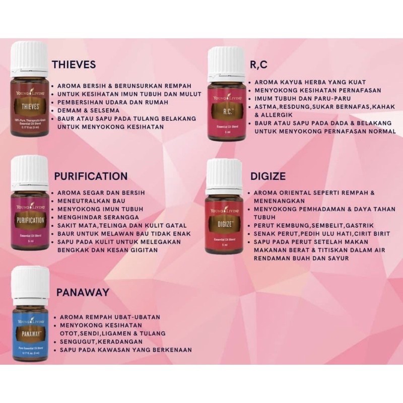. ESSENTIAL OIL YOUNG LIVING Assalammualaikum wbt. 4 Young Living Essential Oil Akhir sekali essential oil ini memang aku dah sedia ada tapi tak tau kenapa gatal beli yang lain-lain tu. Tapi kali ni aku memang ikhtiar untuk guna EO ni sebelum ikhtiar bawak pergi klinik.